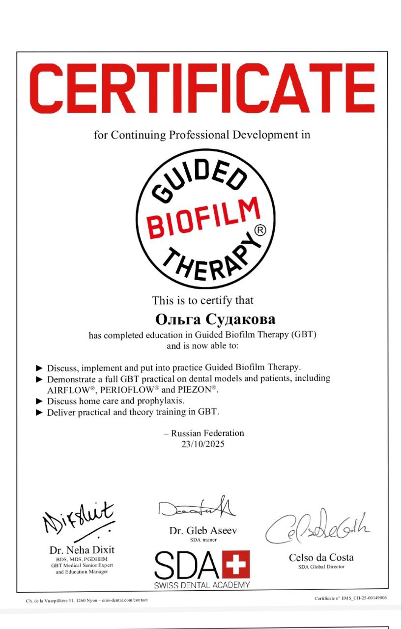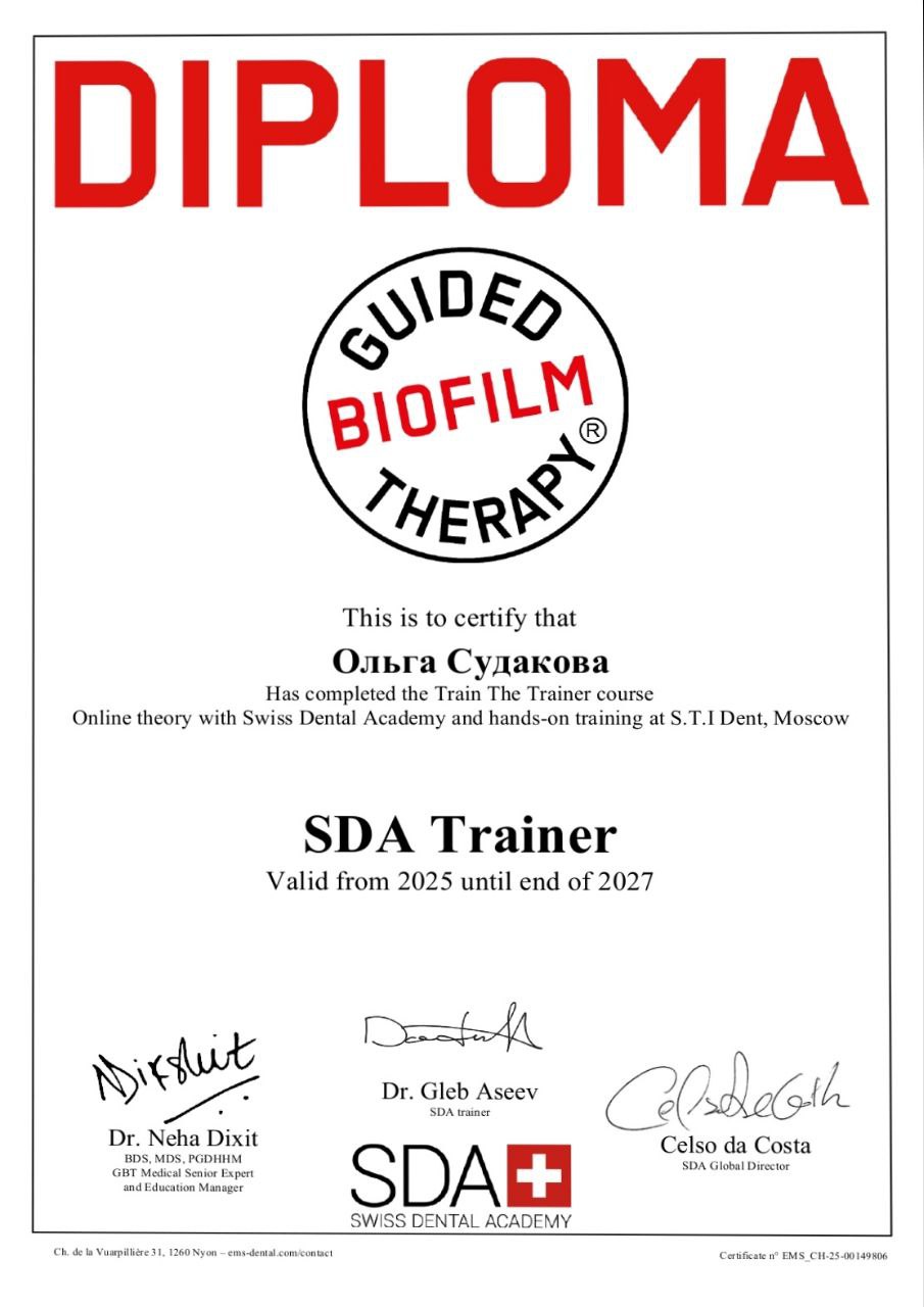 Судакова Ольга Николаевна успешно прошла интенсивный практический курс «Hands-On Training» и получила сертификацию SDA (Swiss Dental Academy)!